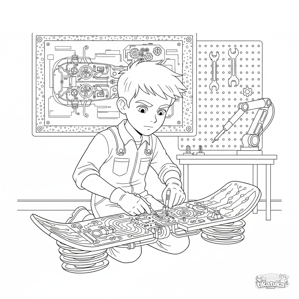 Página para colorear detallada para niños 10-12 años: un niño ingeniero en un laboratorio secreto repara una aerotabla voladora con un esquema. Escena con detalles mecánicos.