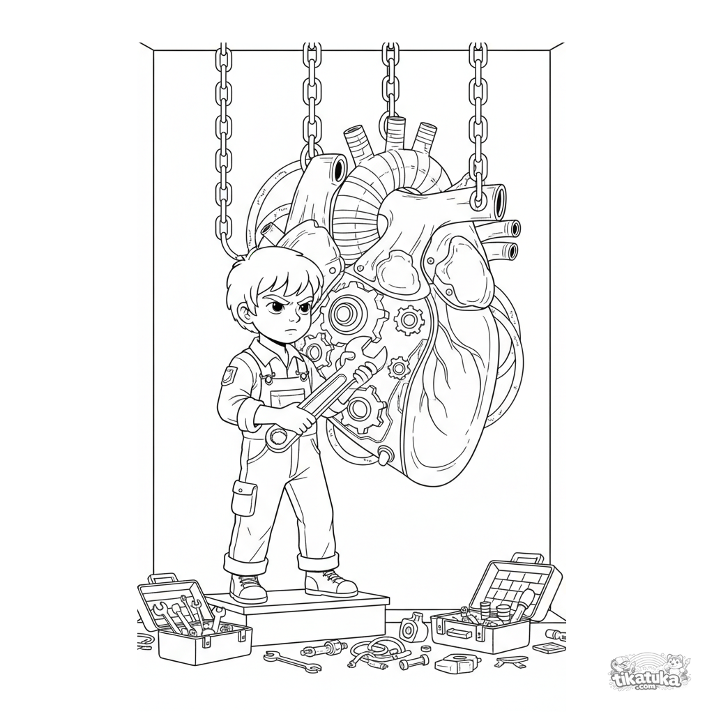 Página para colorear detallada para niños 10-12: un niño ingeniero en un laboratorio secreto repara un corazón mecánico gigante con engranajes.