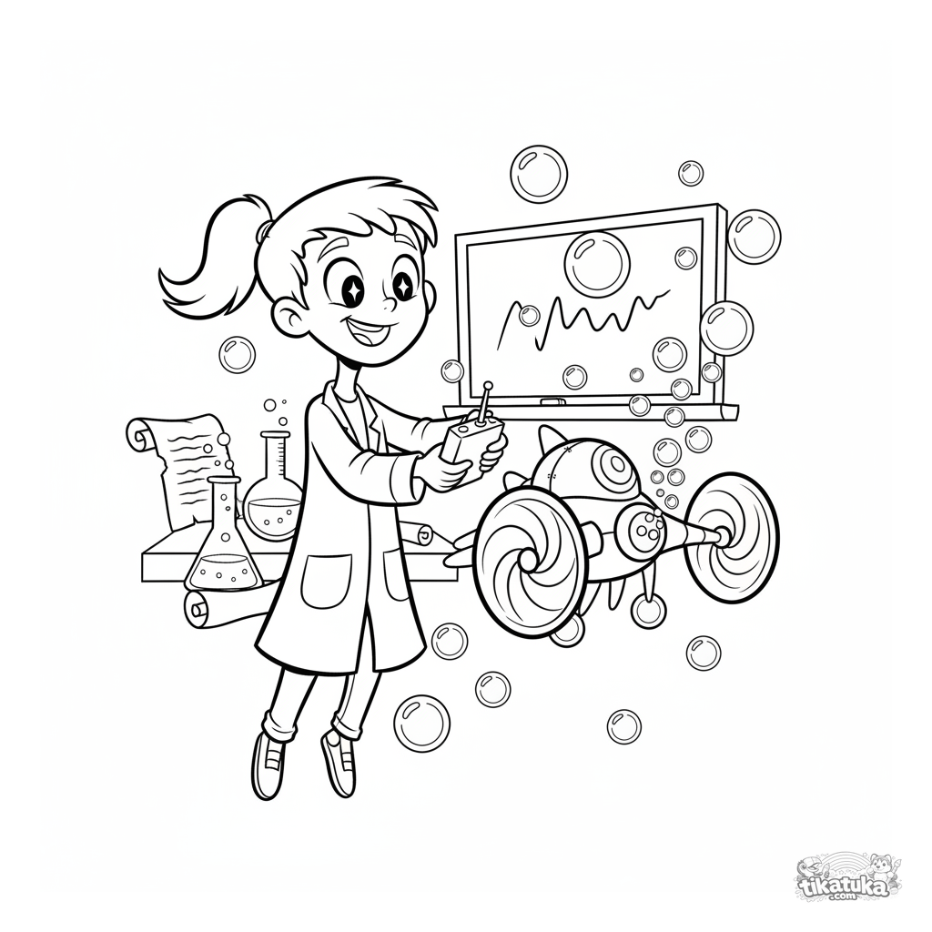 Página para colorear para niños 4-6: un niño con bata de laboratorio prueba un divertido artilugio volador que suelta un chorro de burbujas iridiscentes.