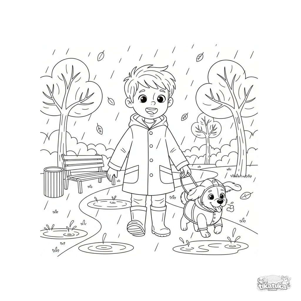 Página para colorear para niños de 7-9 años: un niño con impermeable pasea a su perro en un parque de otoño bajo la lluvia. Detalle moderado, poses expresivas.