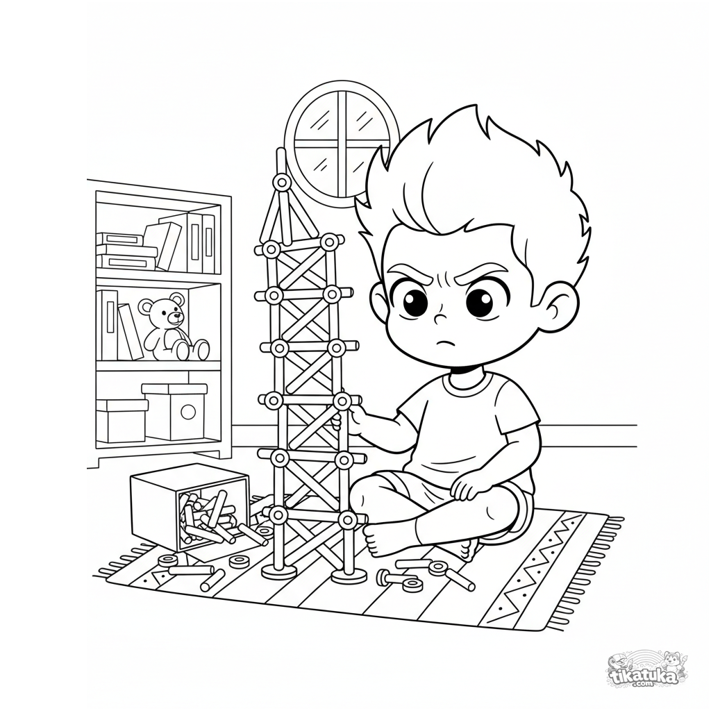 Página para colorear para niños de 4 a 6 años: un niño concentrado construye una torre alta con piezas de juguete. Escena simple para colorear.