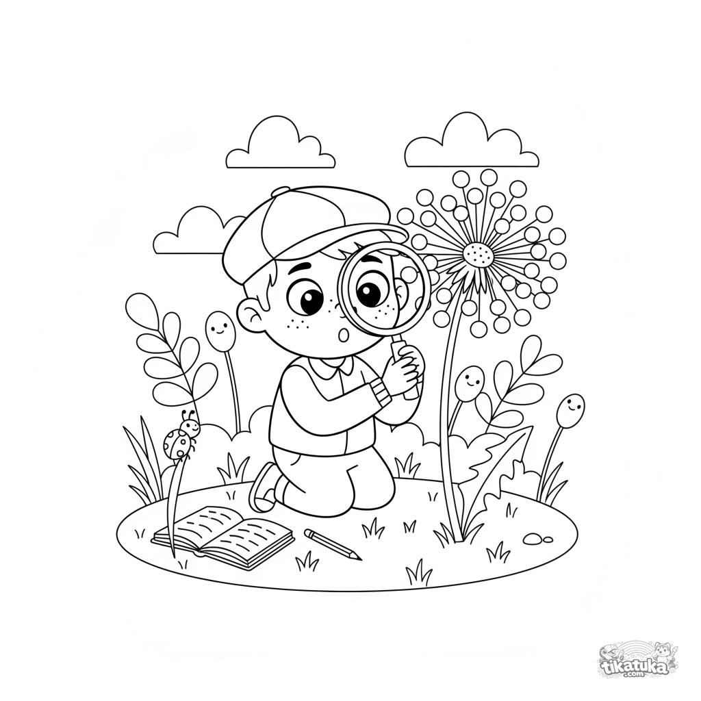 Página para colorear de un niño curioso usando una lupa para examinar un gran diente de león. Para niños de 5 a 8 años.