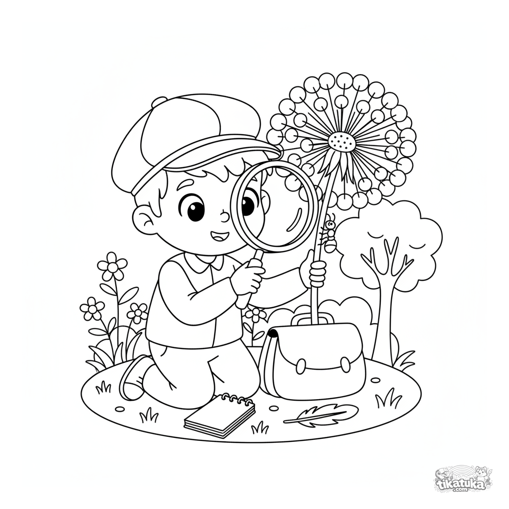 Página para colorear para niños: un joven explorador con lupa inspecciona un diente de león gigante. Para niños de 5 a 8 años. Escena con mochila, cuaderno y hormiga.