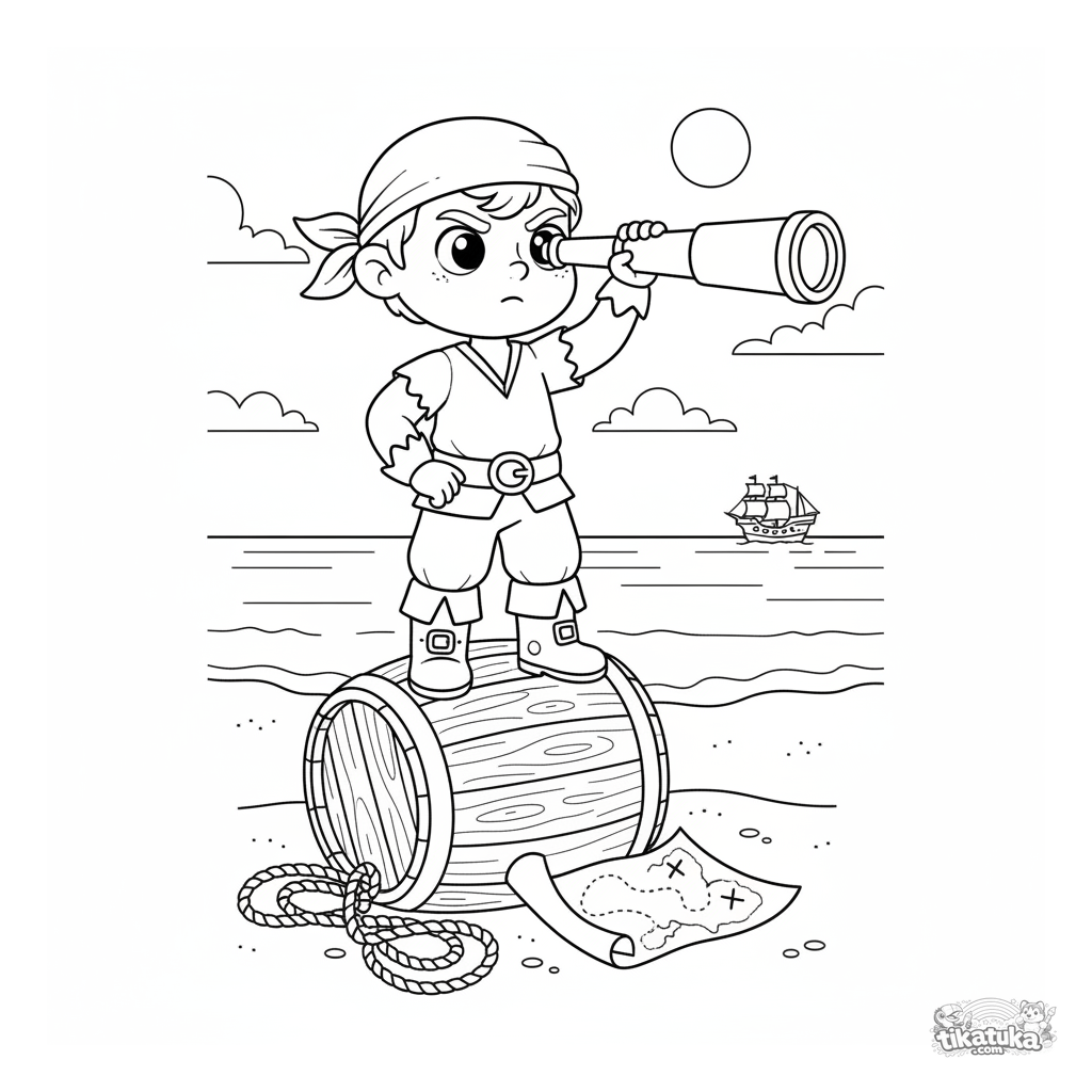 Página para colorear para niños: un joven pirata en un barril mira a través de un catalejo en la playa. Para niños de 4 a 6 años.