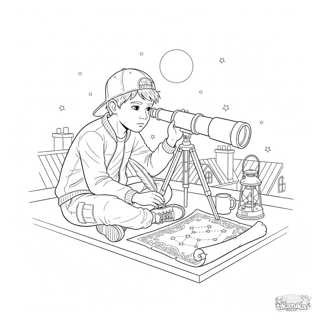 Página para colorear para niños 7-12: un niño concentrado en una azotea nocturna estudia estrellas con un telescopio y traza una constelación en un mapa antiguo. Alto detalle, estilo realista.