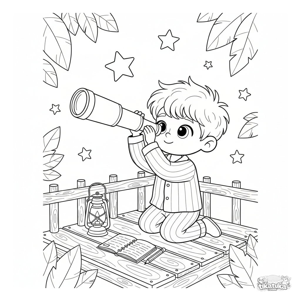 Página para colorear para niños de 4 a 6 años. Un niño curioso en pijama mira a través de un telescopio las estrellas desde la plataforma de su casa del árbol.