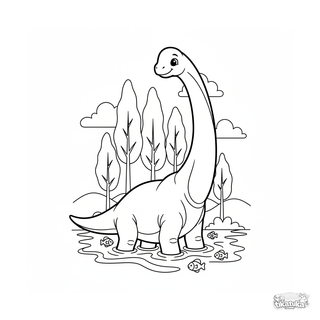 Página para colorear para 7-9 años: un majestuoso brachiosaurus adentrándose en el agua de un océano antiguo para alcanzar hojas de los árboles.