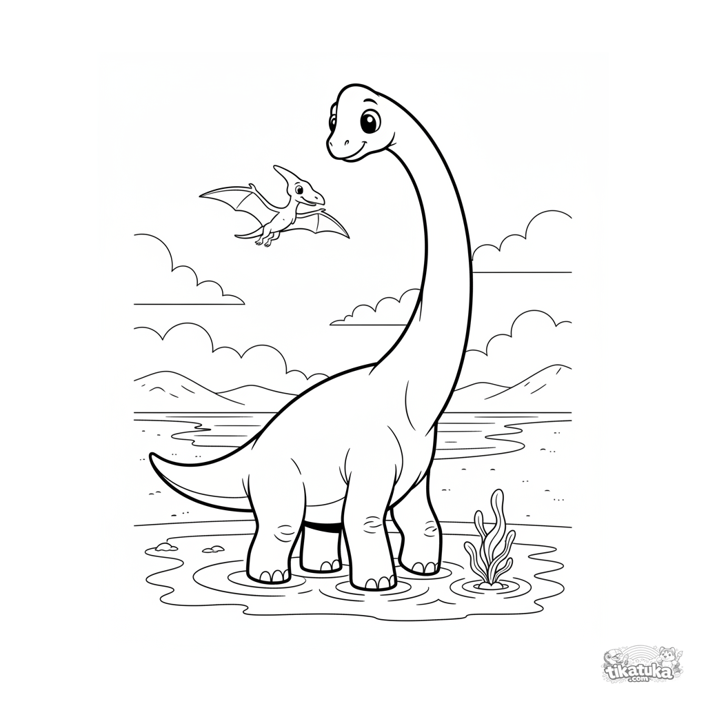 Página para colorear para 7-9 años: un majestuoso brachiosaurus vadeando en la calma arrebentación de un océano antiguo. Escena en estilo clásico de dibujos animados.