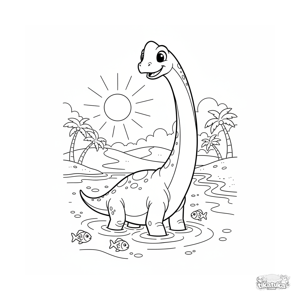 Página para colorear para niños 7-9 en estilo clásico: un majestuoso brachiosaurus vadea en las aguas poco profundas de un océano antiguo. Líneas fluidas, escena épica.