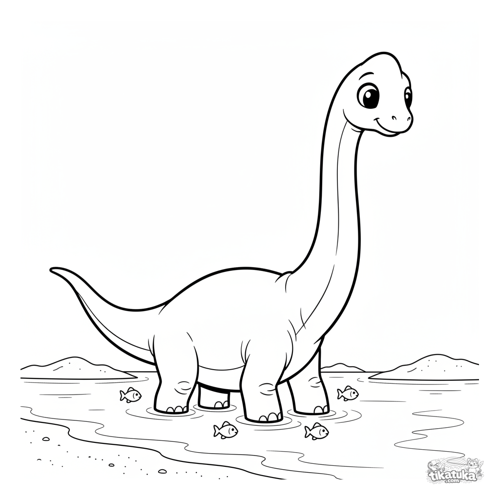 Página para colorear para 7-9 años: un gigantesco brachiosaurus vadea lentamente por las aguas poco profundas de un océano antiguo cerca de una playa de arena. Pequeños peces nadan alrededor, escena en estilo boceto.