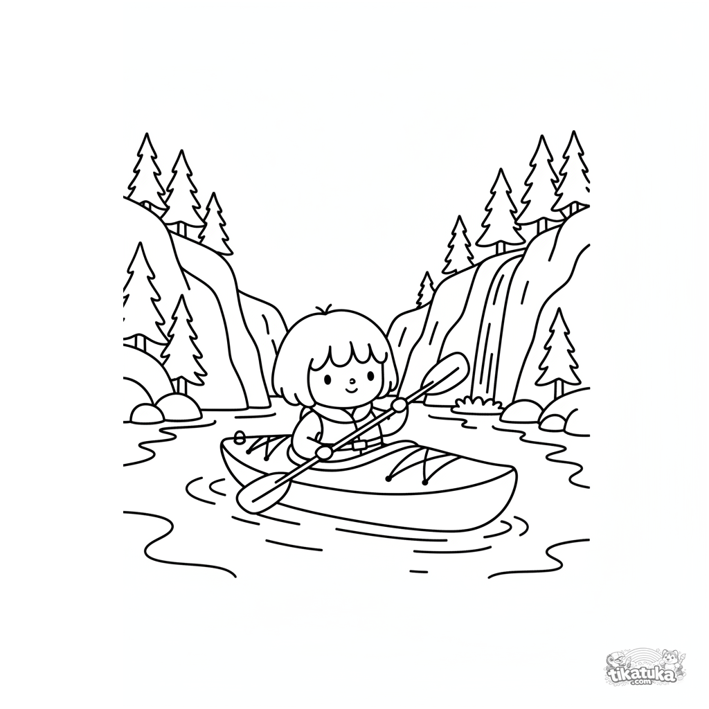 Página para colorear para niños de 4-6 años: un kayak brillante con remero navega por un fiordo tranquilo entre acantilados y pinos. Cascada a lo lejos, escena pacífica.