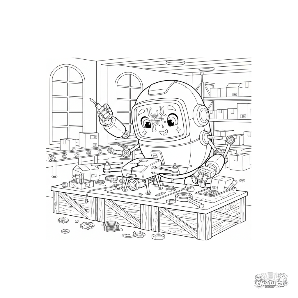 Página para colorear para niños mayores 10-12: un robot con forma de caja de herramientas repara un dron roto en un banco de trabajo improvisado en un almacén.