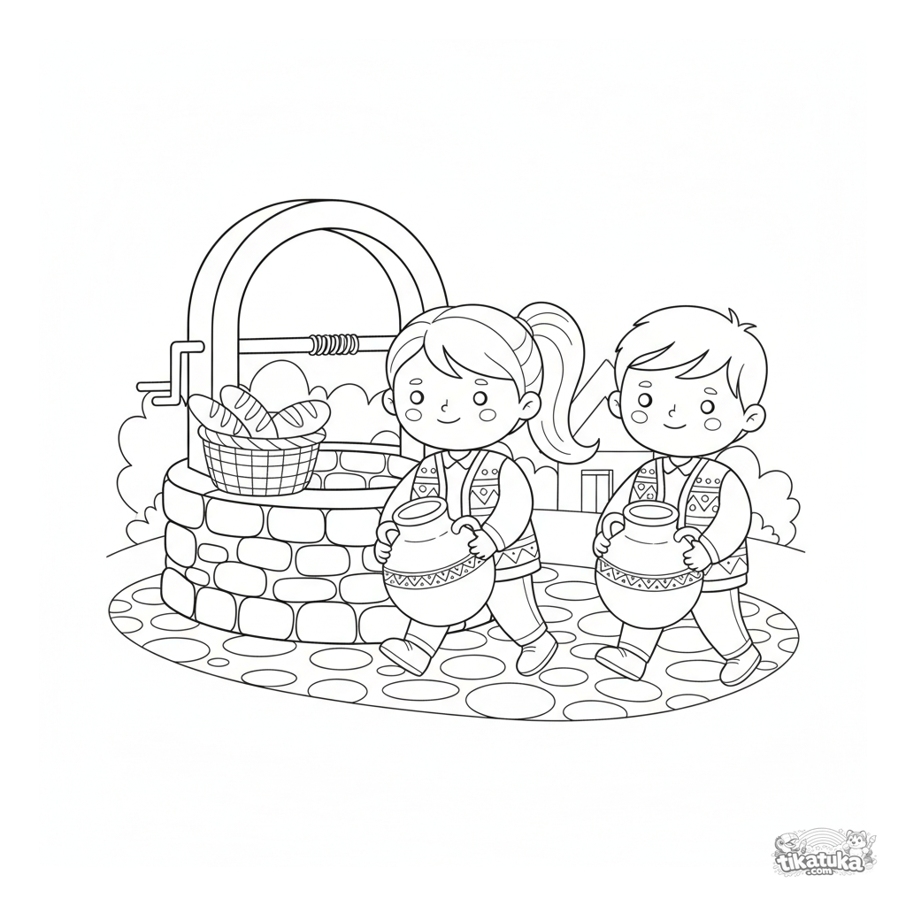 Página para colorear para niños 4-6: un hermano y una hermana con chalecos tradicionales llevan cántaros de agua del pozo. Escena en estilo juguete de madera.