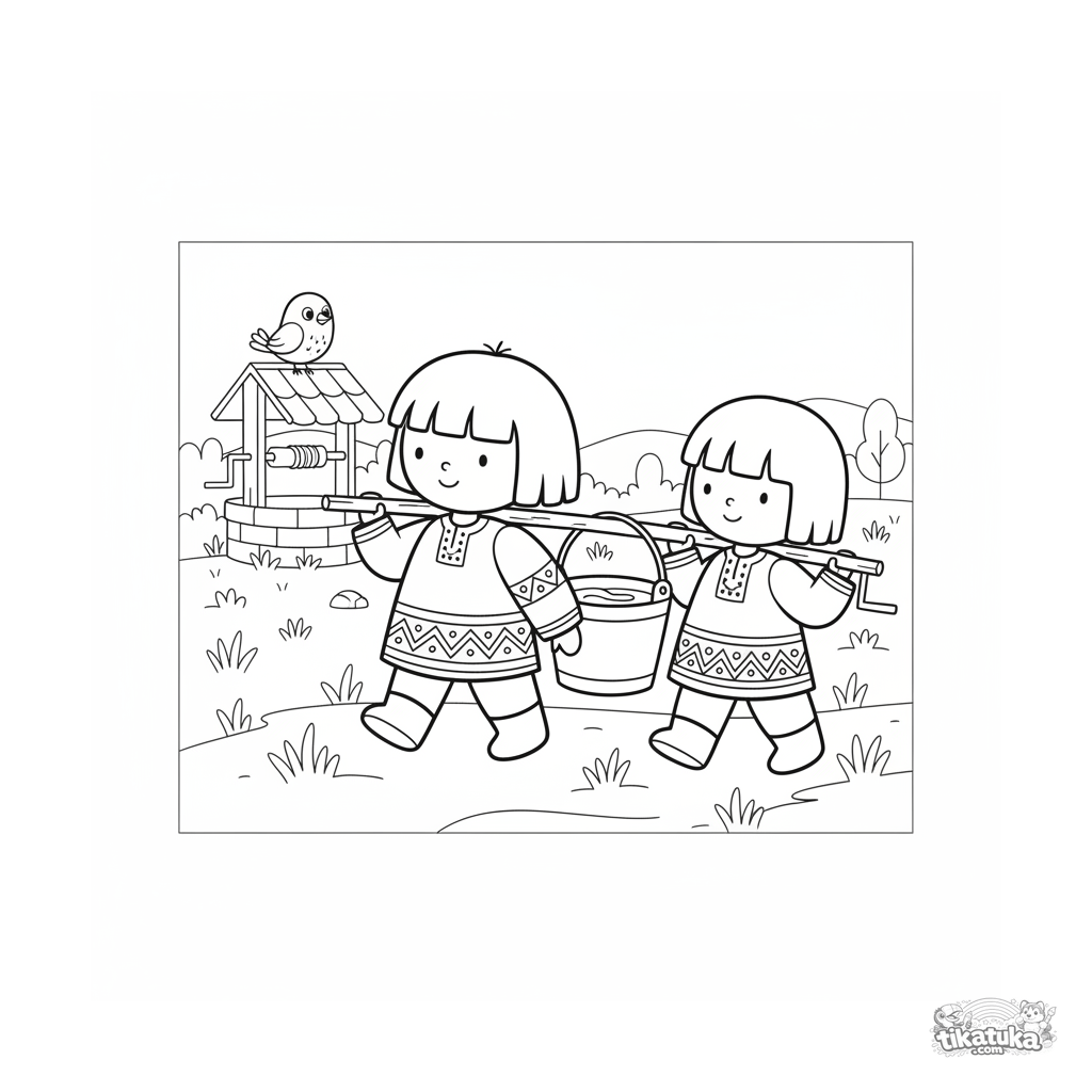 Página para colorear para niños 4-6: un hermano y una hermana llevan un cubo de agua desde el pozo. Estilo juguete de madera, formas geométricas.