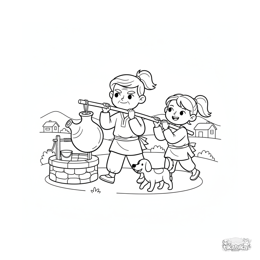 Página para colorear para preadolescentes 7-9: un hermano y una hermana llevan un gran cántaro de agua viva del pozo. Historia cálida sobre ayudar, dos personajes.