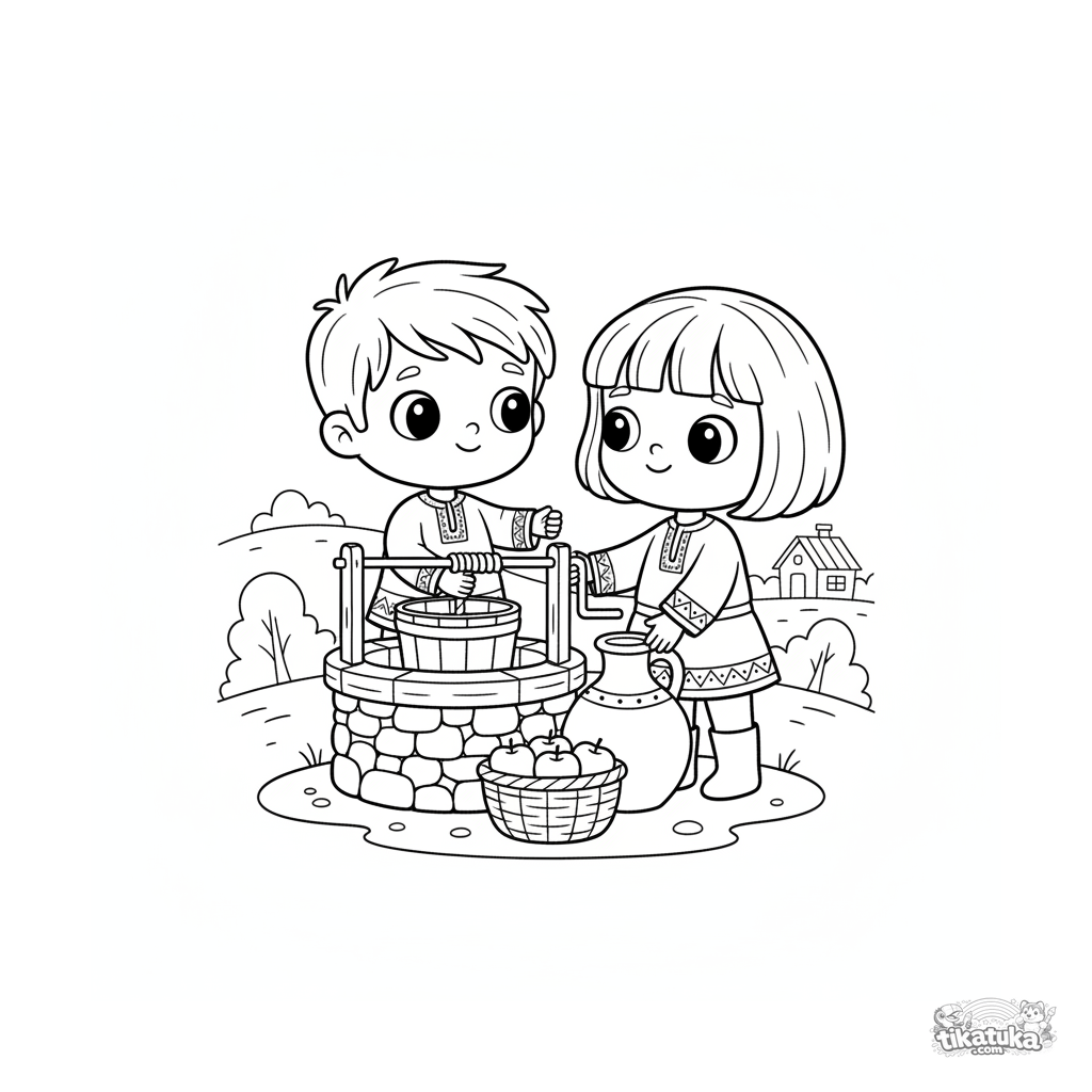 Página para colorear para niños 7-9: un hermano y una hermana trabajan juntos para sacar agua del pozo mágico. Escena cálida de cooperación en estilo folclórico.