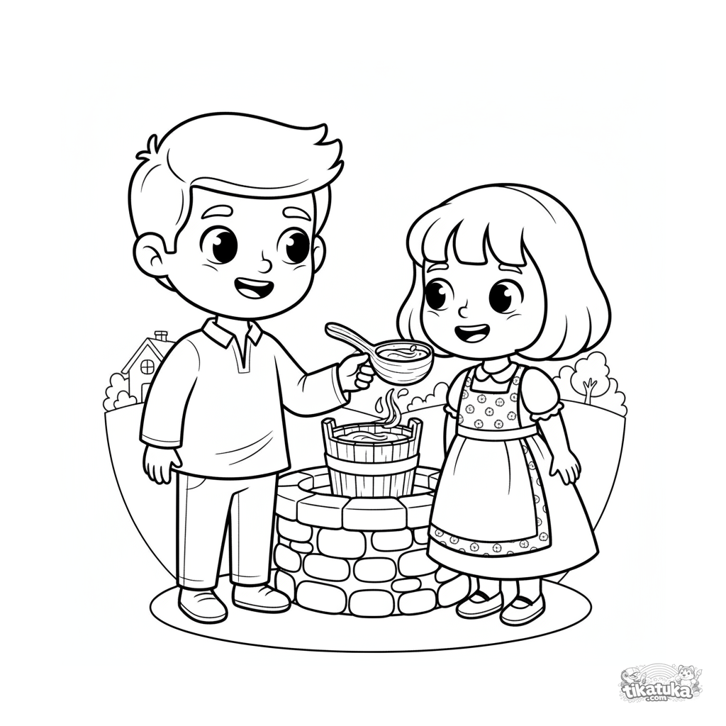Página para colorear para niños 7-9: un hermano y una hermana con trajes tradicionales beben agua del pozo mágico. Escena cálida sobre ayuda y familia en estilo folclórico.