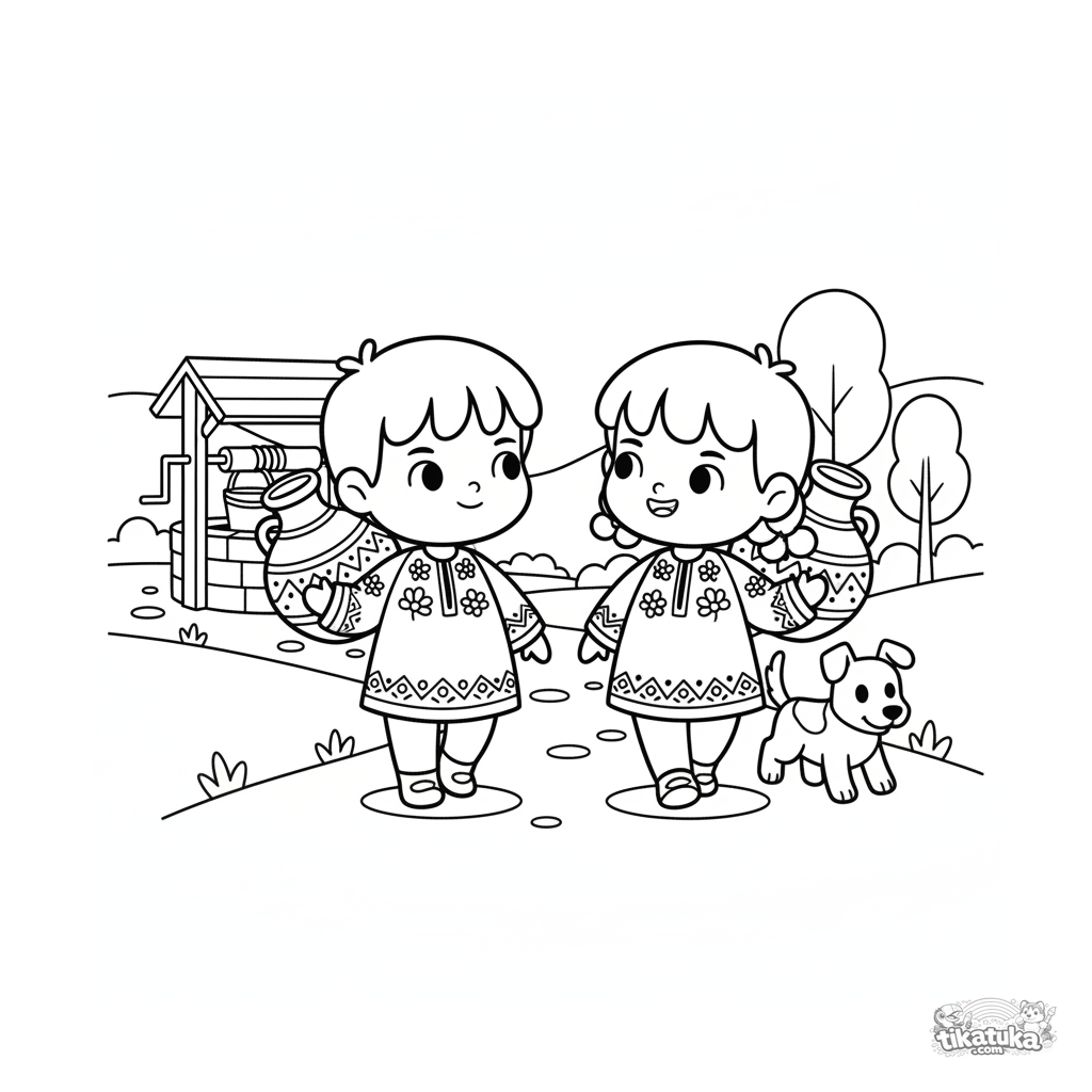 Página para colorear para niños 4-6: un hermano y una hermana con trajes folklóricos llevan cántaros de agua desde el pozo. Formas geométricas claras, historia positiva.