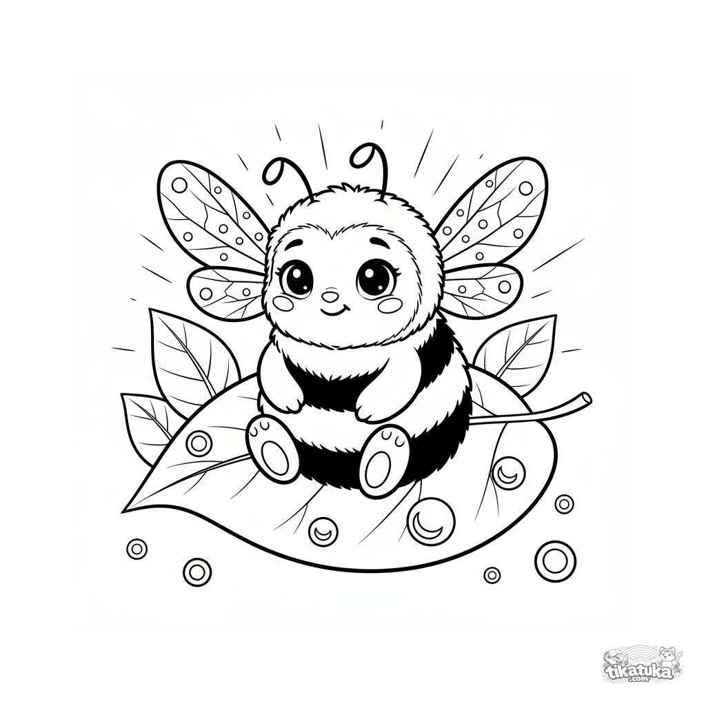 Página para colorear para 7-9 años: un abejorro esponjoso seca sus alas en una hoja grande después de una lluvia de rocío. Escena linda y tranquila con detalles moderados.