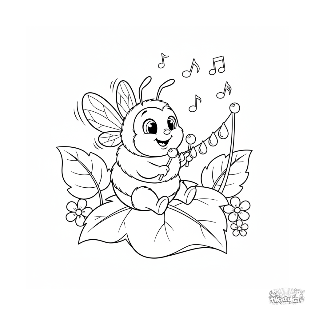 Página para colorear para niños 4-6: un abejorro toca un xilófono de gotas de rocío. Escena musical divertida.