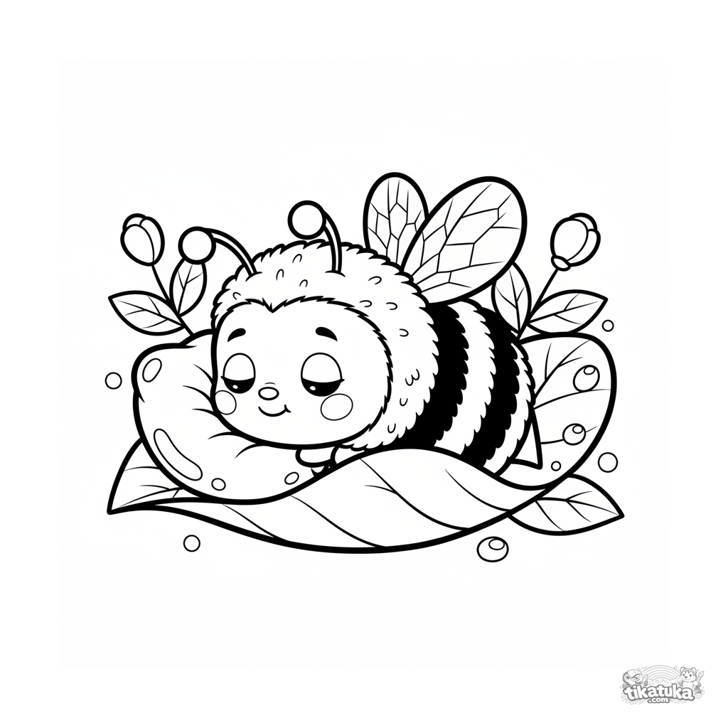 Página para colorear linda para niños: un abejorro peludo duerme cómodamente en una hoja ahuecada, usando una gota de rocío como almohada. Estilo chibi.