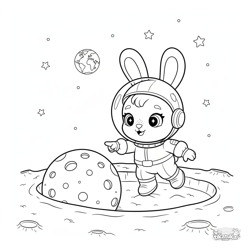 Página para colorear para niños 4-6: conejo panadero en traje espacial explorando la superficie lunar. Estilo de marioneta suave, estrellas y cráteres simples, márgenes amplios.