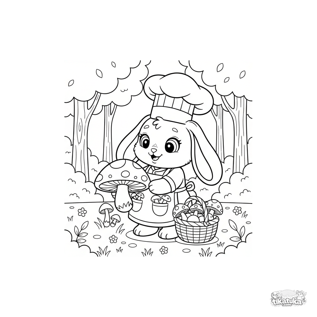 Página para colorear para niños 4-6: lindo conejo panadero recolectando hongos en el bosque. Líneas simples, estilo de peluche escandinavo, amplios márgenes para colorear.
