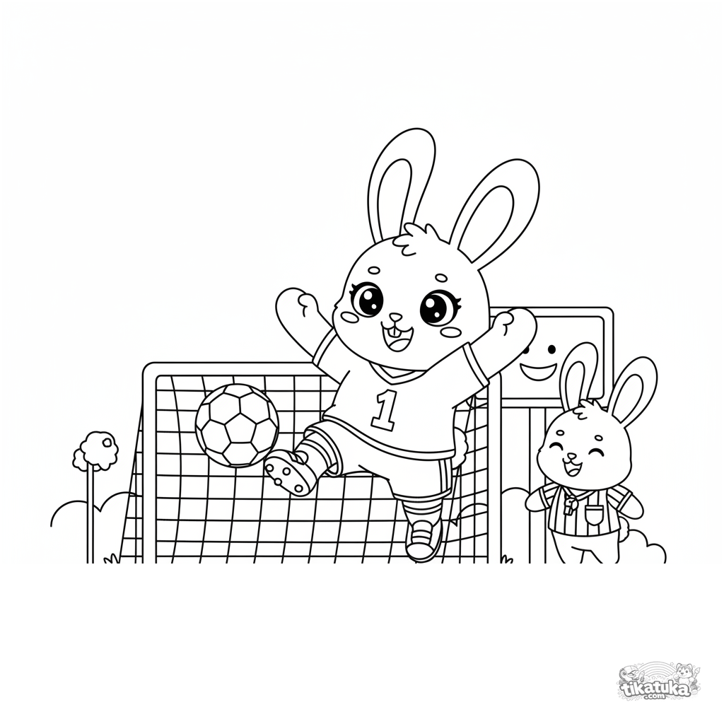 Página para colorear para niños 4-6: conejo futbolista anotando un gol ganador en el campo. Escena deportiva dinámica en estilo mascota de peluche.