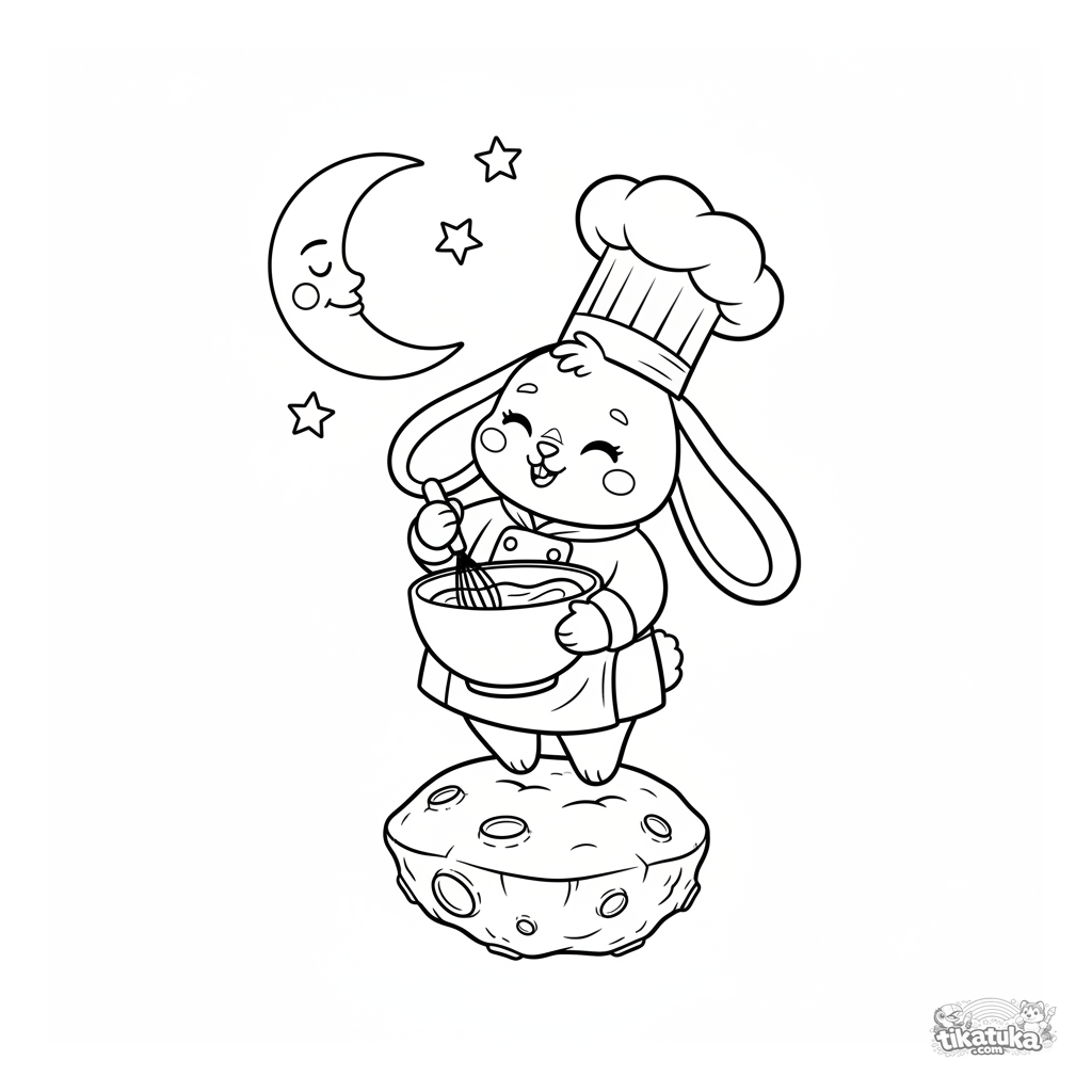 Página para colorear espacio para niños 4-6: conejo panadero en gravedad cero mezcla masa de pastel en un asteroide pequeño, con una luna sonriente cerca. Estilo de marioneta suave, fondo simple.
