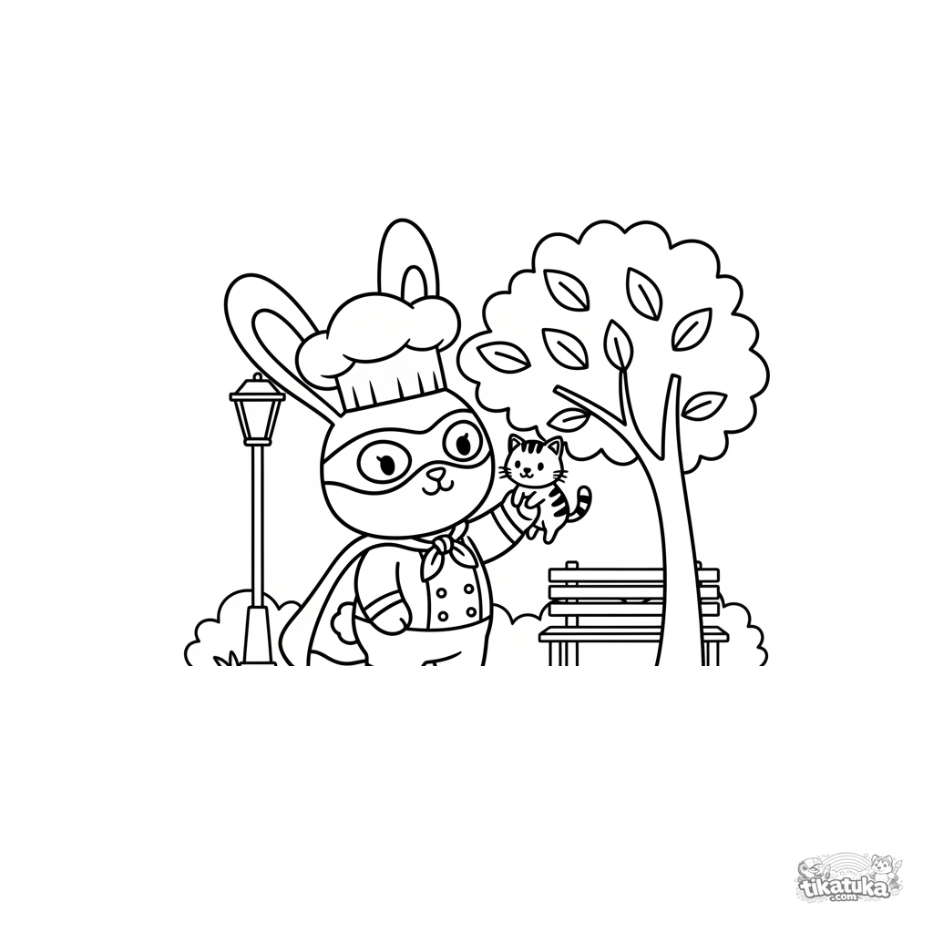 Página para colorear para niños 4-6: superhéroe conejo panadero con máscara y capa rescata a un gatito atrapado en un árbol del parque. Estilo geométrico de juguete de madera.