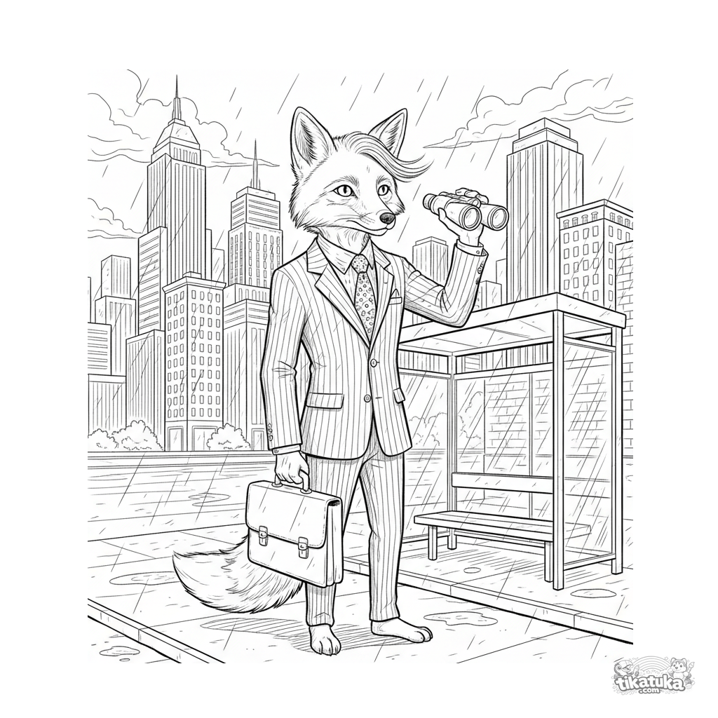 Página para colorear para niños 10-12: un zorro en traje de negocios con maletín y binoculares en una parada de autobús lluviosa, mirando hacia los bancos. Escena en estilo sketch urbano.