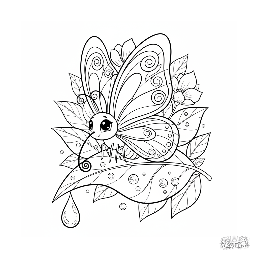 Página para colorear para 7-9 años estilo art-nouveau: una mariposa grácil con alas con patrones bebe agua de una gota de rocío.