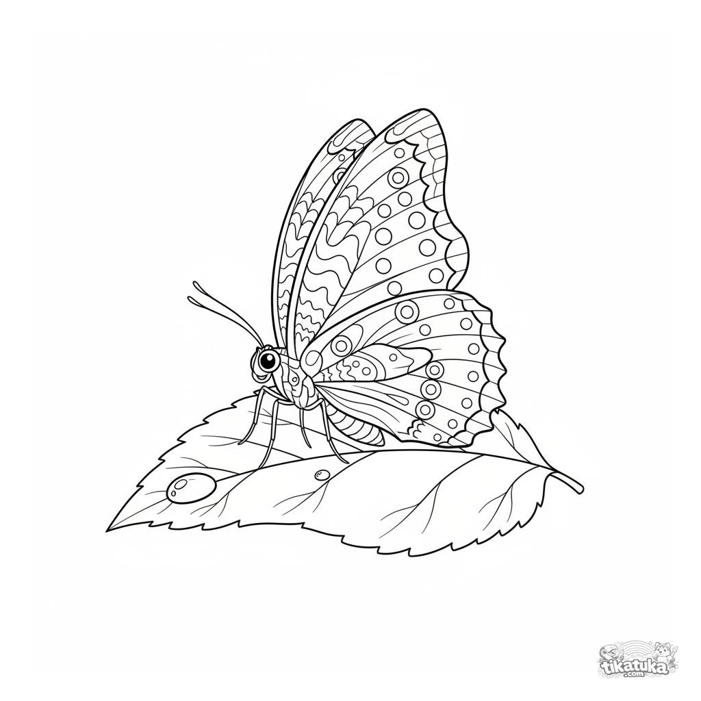 Página para colorear realista compleja para niños mayores 10-12: una mariposa con alas detalladas bebe de una gota de rocío. Alto nivel de detalle anatómico.