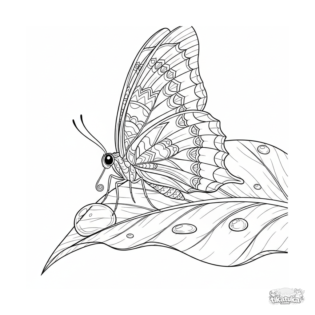Página para colorear realista para niños mayores de 10-12 años: una mariposa con alas estampadas bebe agua de una gota de rocío en una hoja. Anatomía detallada, texturas naturalistas, fondo rico.