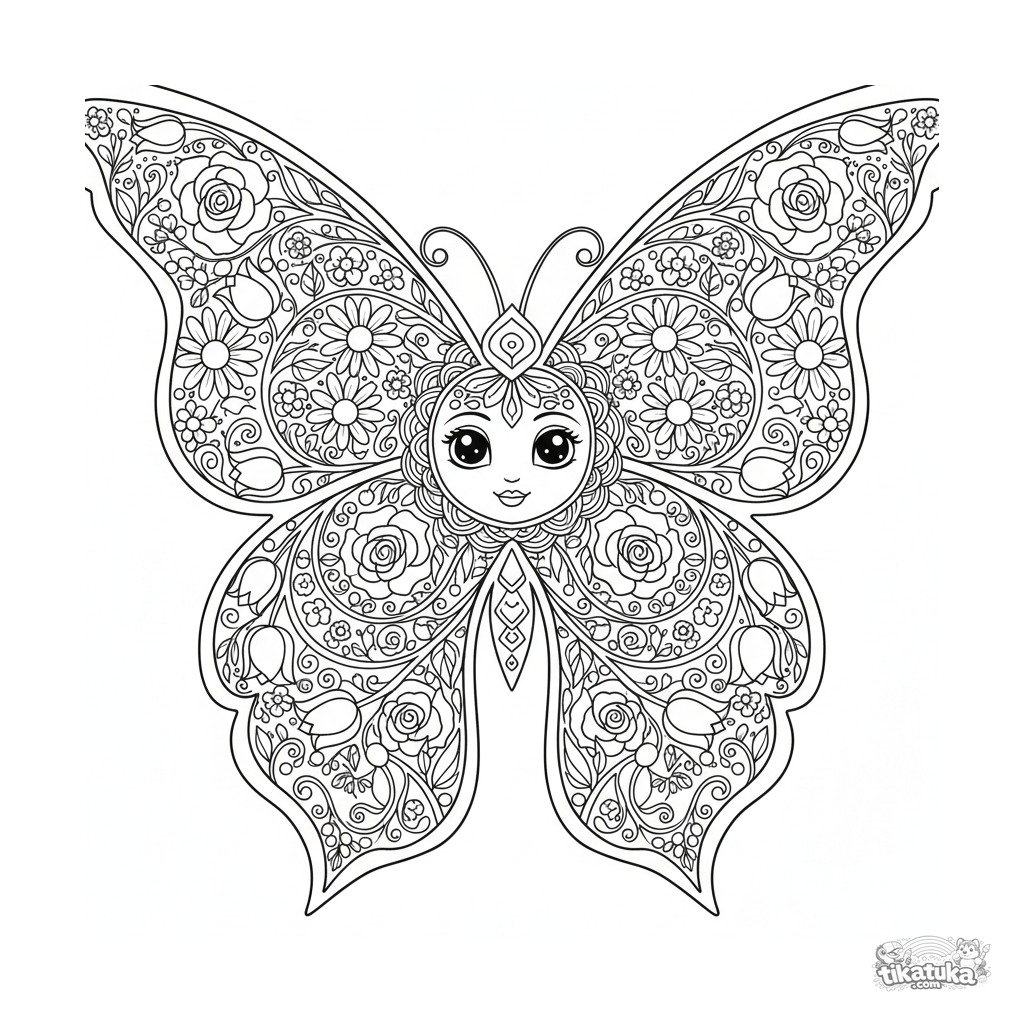 Página para colorear de mandala única con forma de ala de mariposa, llena de flores y hojas. Un patrón botánico simétrico intrincado para niños de 10 a 12 años, inspirado en el estilo Art Nouveau.