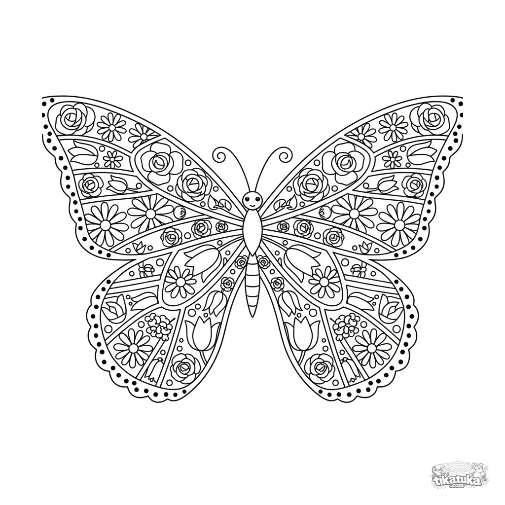 Página para colorear de mandala de ala de mariposa detallada para 10-12 años. Cuerpo central, alas en espejo divididas en compartimentos con diferentes patrones florales. Diseño complejo y simétrico para amantes de la naturaleza.