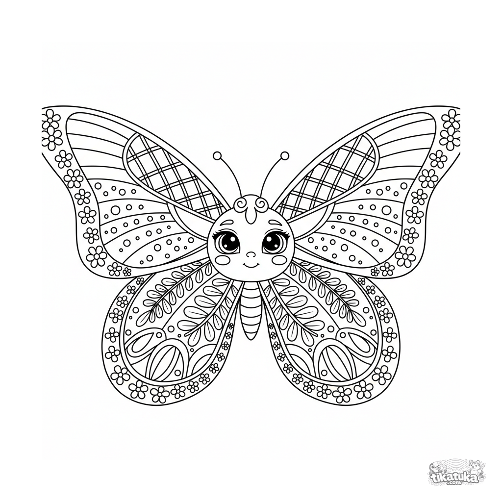 Página para colorear de mandala de ala de mariposa detallada para 10-12 años. Simetría especular, segmentos con celosía, puntos, helechos y flores. Patrón ornamental intrincado.