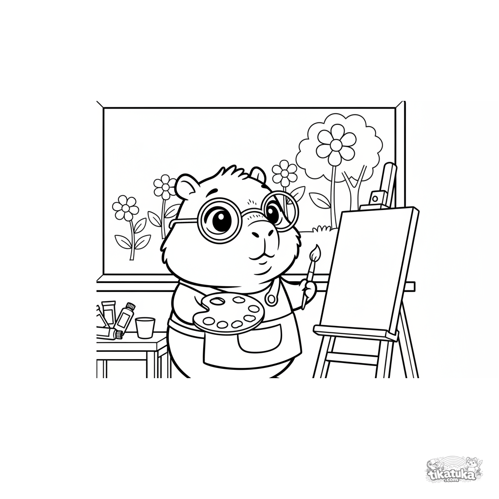 Página para colorear para niños 4-6: una capibara profesora de arte en el aula junto a una pizarra con dibujos. Sosteniendo una paleta y un pincel, animal lindo con bata.