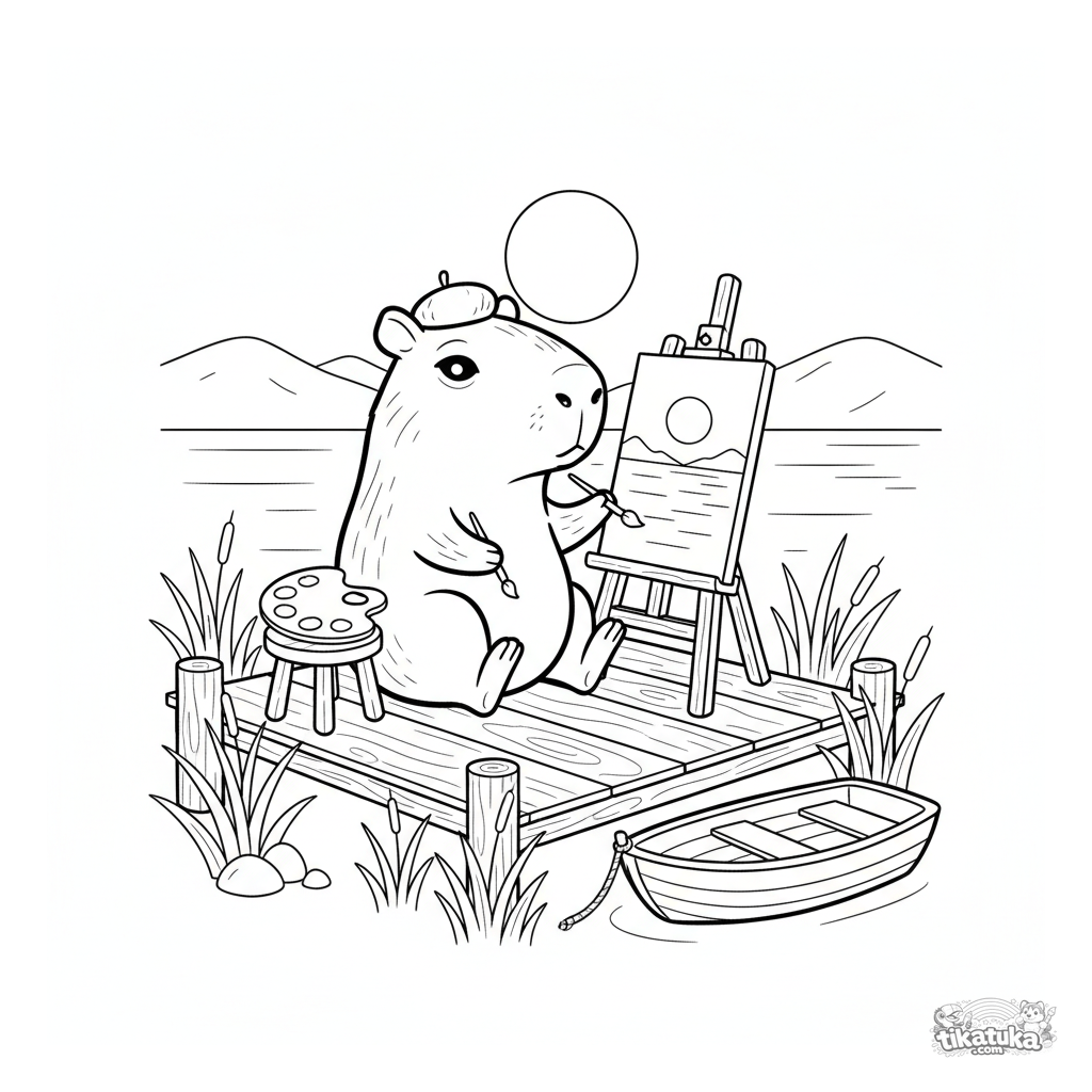 Página para colorear para niños de 7-9 años: un capibara con boina pinta el atardecer junto a un lago. Escena creativa y tranquila.