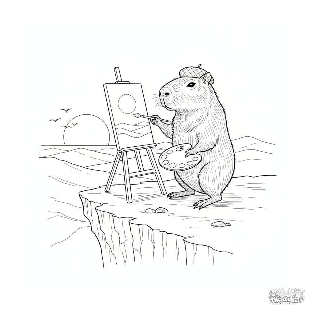 Página para colorear detallada para niños de 10 a 12 años: un capibara artista pintando el atardecer en un caballete al borde de un acantilado. Estilo acuarela.