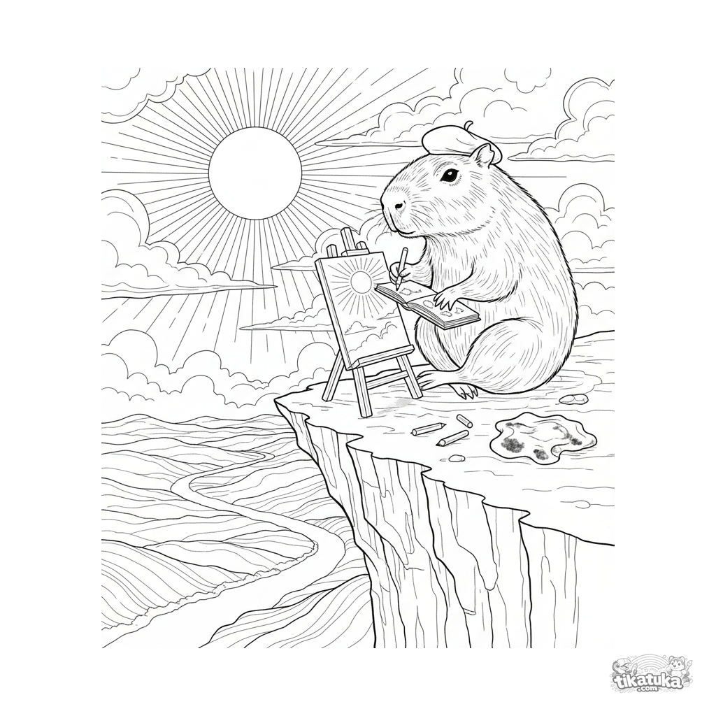 Página detallada para colorear para niños 10-12: un carpincho con boina dibuja el atardecer en un caballete.