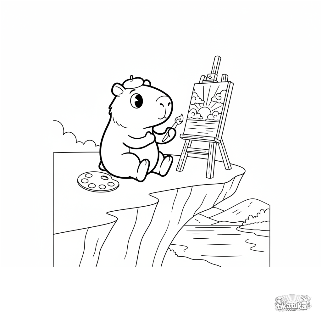 Página para colorear: un carpincho con boina pintando el atardecer sobre un lago. Para niños de 7 a 9 años. Escena con caballete y pinturas.