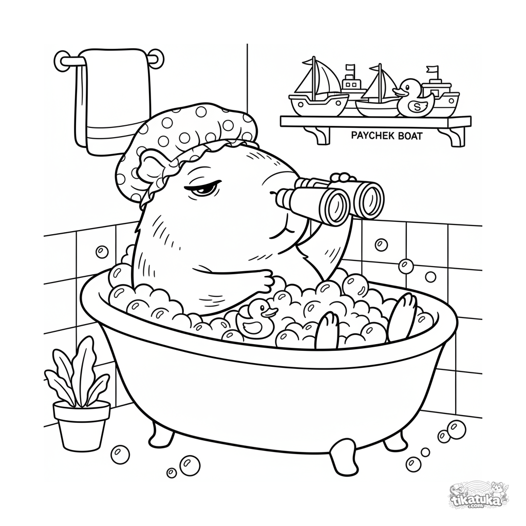 Página para colorear para niños 10-12: una capibara con gorro de ducha se relaja en una bañera con espuma, usando prismáticos para buscar el barco del sueldo.