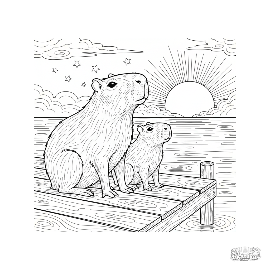 Página detallada para colorear para niños de 10-12 años: dos carpinchos en pose tranquila observan estrellas al atardecer desde un muelle de madera. Escena de amistad y tranquilidad.