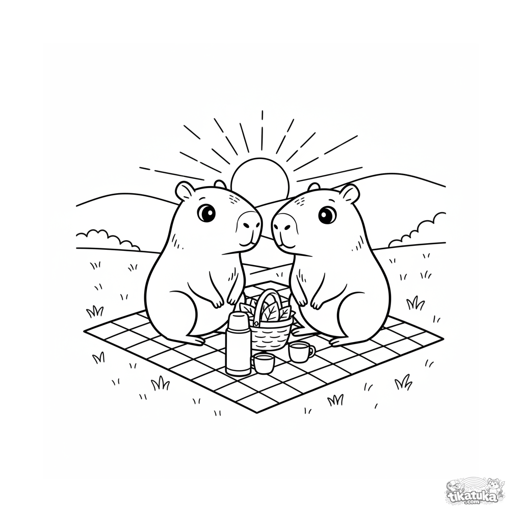 Página para colorear para niños 4-6: dos capibaras sentados juntos en un picnic, mirando el atardecer. Dulce escena en estilo de ilustración de cuento.