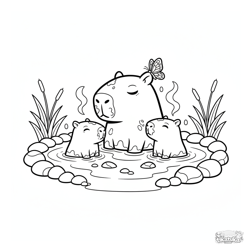 Página para colorear para niños de 4-6 años: una escena pacífica de una familia de carpinchos disfrutando de un baño de lodo tibio entre los juncos. Perfecto para colorear relajado.