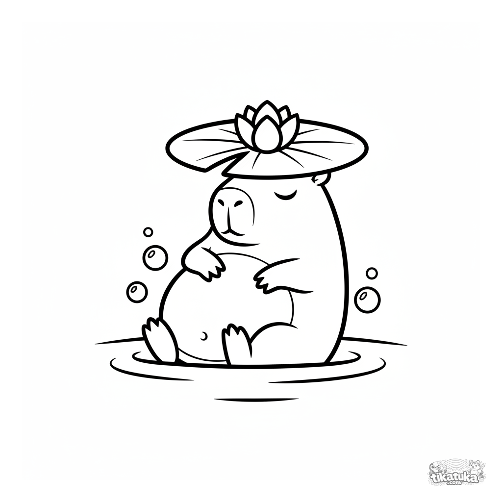 Página para colorear simple para niños pequeños de 2-3 años: una capibara tranquila flotando de espaldas en el agua, con un nenúfar como sombrero.