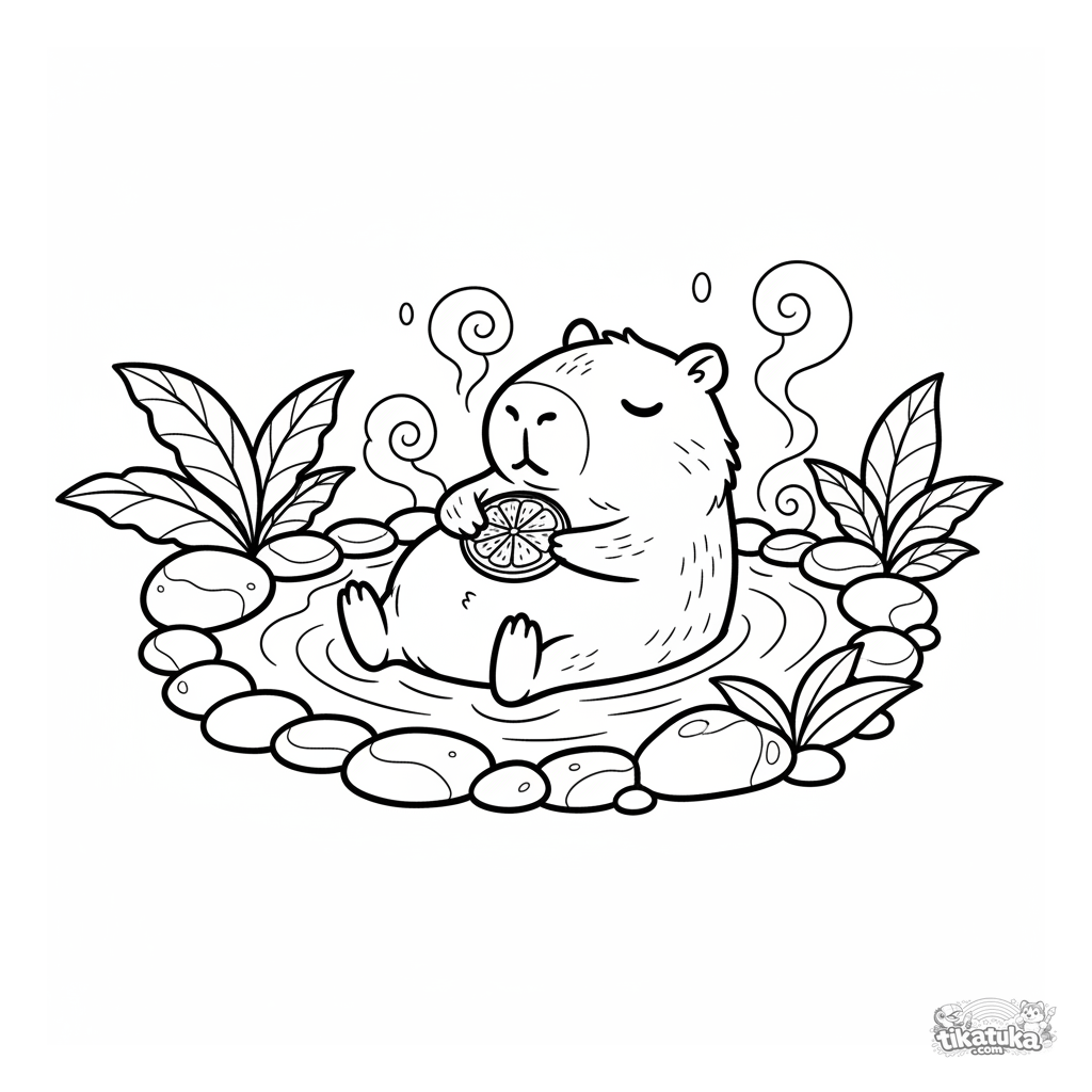 Página detallada para colorear para niños mayores 7-12: una capibara en máxima relajación flota de espaldas en un manantial de aguas termales, equilibrando un gajo de naranja en su vientre.