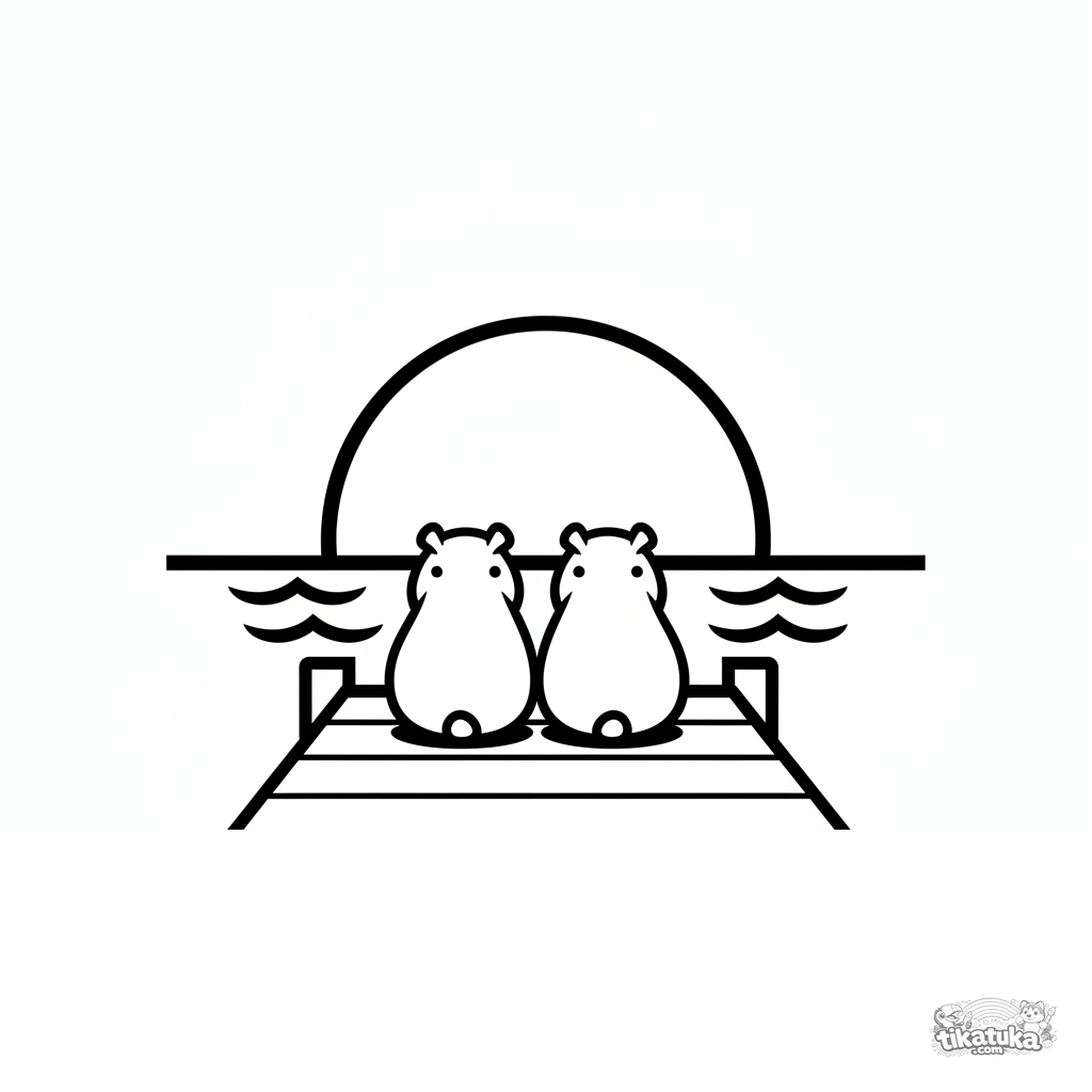 Página para colorear muy simple para niños pequeños 2-3: dos carpinchos amigos sentados en un muelle mirando el atardecer. Formas grandes, detalles mínimos.