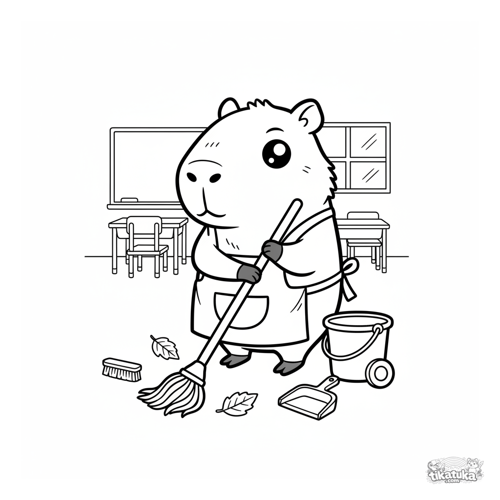 Página para colorear para niños 4-6: un capibara conserje con una fregona en un aula. Escena linda y tranquila.